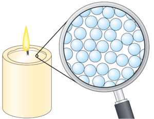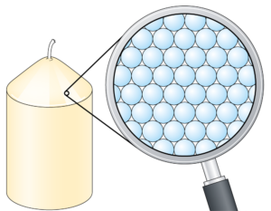 In festem Kerzenwachs sind die Teilchen regelmäßig angeordnet. Der Abstand zwischen ihnen ist sehr klein. Die Teilchen bewegen sich kaum. Die Anziehungskräfte zwischen den Teilchen, die sich an vielen Stellen berühren, sind sehr groß.