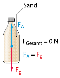 b Die Flasche muss eine Gesamtdichte von 1 g/cm³ haben, um im Wasser zu schweben. Das Volumen der Flasche ist 1000 cm³. Die leere Flasche wiegt 10 g. Um die Flasche zum Schweben zu bringen, muss die Masse des Sandes plus die Masse der Flasche gleich der Masse des verdrängten Wassers sein, also 1000 g. Daher muss Stefan 990 g Sand in die Flasche füllen.