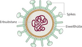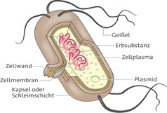 b Bakterien haben eine Zellwand, Zellmembran, Zellplasma, Ribosomen und ein Plasmid. Außerdem können sie Geißeln besitzen. Viren hingegen haben keine Zellstruktur. Sie bestehen nur aus einer Proteinhülle mit Spikes und der Erbsubstanz.