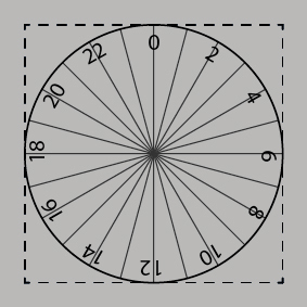 - Schneide das Ziffernblatt quadratisch aus. Die Schnittlinie soll den Kreis dort treffen, wo 0, 6, 12 und 18 stehen (gestrichelte Linie im Bild).