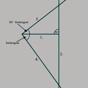 - Zeichne am selben Ende eine Linie im Winkel 90° minus Breitengrad (3). Die Linie muss die zweite Linie schneiden.