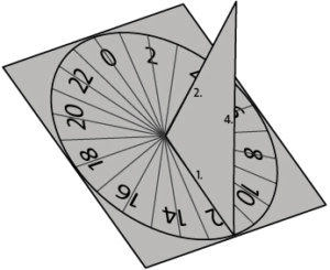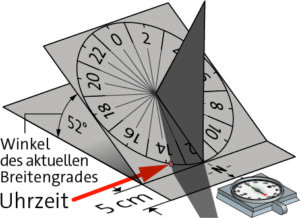 - Steht der Schatten zwischen zwei Linien, ist es die halbe Stunde dazwischen (z. B. zwischen 14 und 15 → 14:30 Uhr).